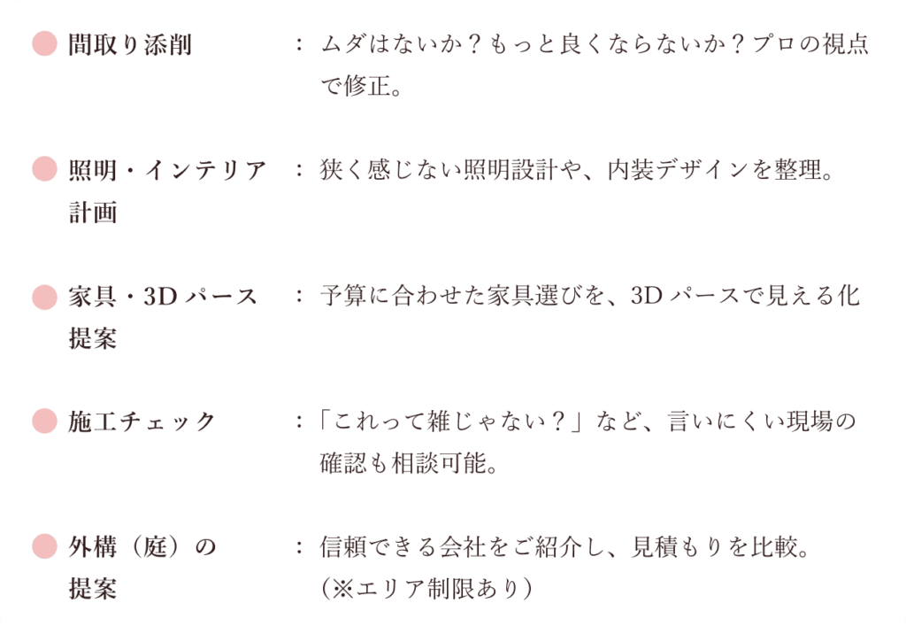 契約前の「判断」から、完成後の「暮らし」まで、全てをサポートします。